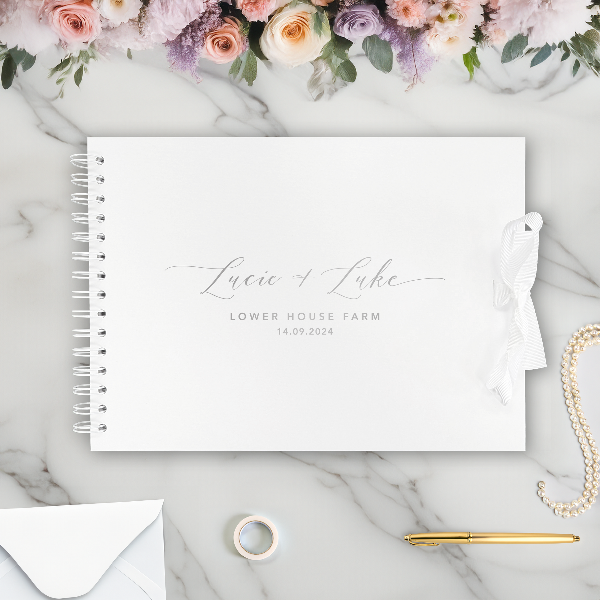 Celebrate your love story with our exquisitely crafted Personalised Wedding Guestbook, a cherished keepsake where memories unfold on every page. Designed for elegance and enduring beauty, this guestbook features a lustrous copper coil and delicate ribbon tie, offering a charming presentation for heartfelt letters, cherished notes, invaluable advice, and pearls of wisdom for the bride and groom.