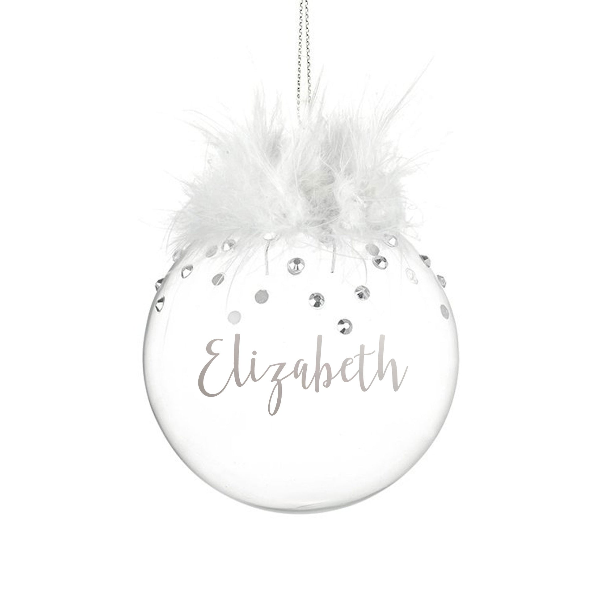 Bring some sparkle to you Christmas tree this season with our personalised glass bauble. Decorated with silver embellishments, and filled with feathers it will be the star of your tree! Personalise with Mr & Mrs or just a name.