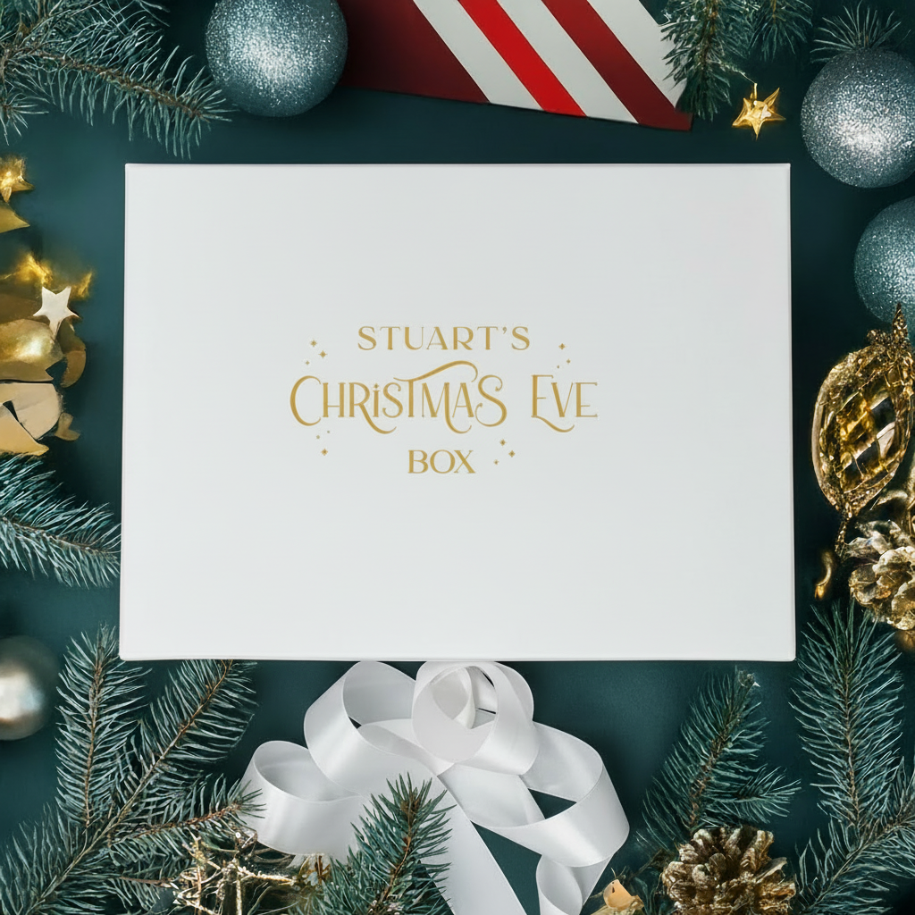 A luxurious personalised Christmas eve gift box available in different sizes and colours.